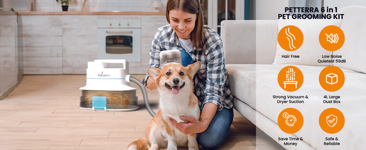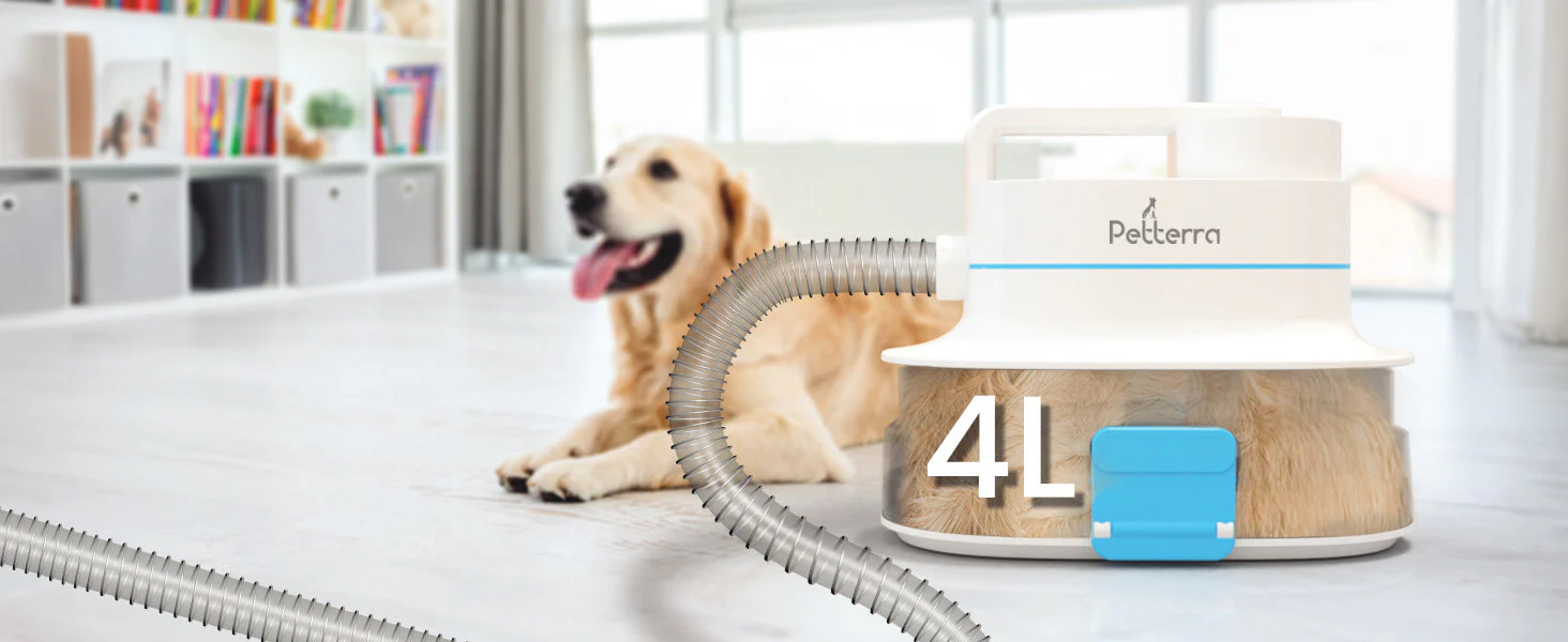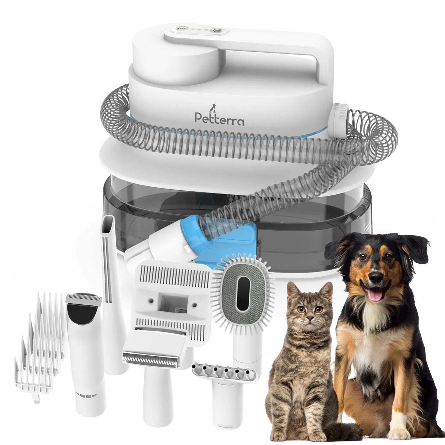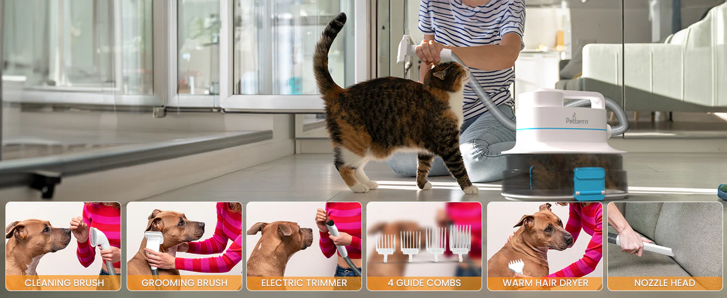 Petterra’s kit combines a pet blower, vacuum cleaner, and trimming tool for effortless grooming