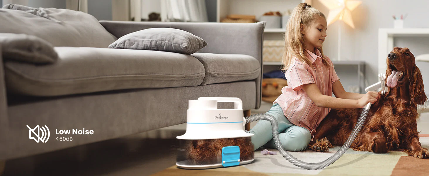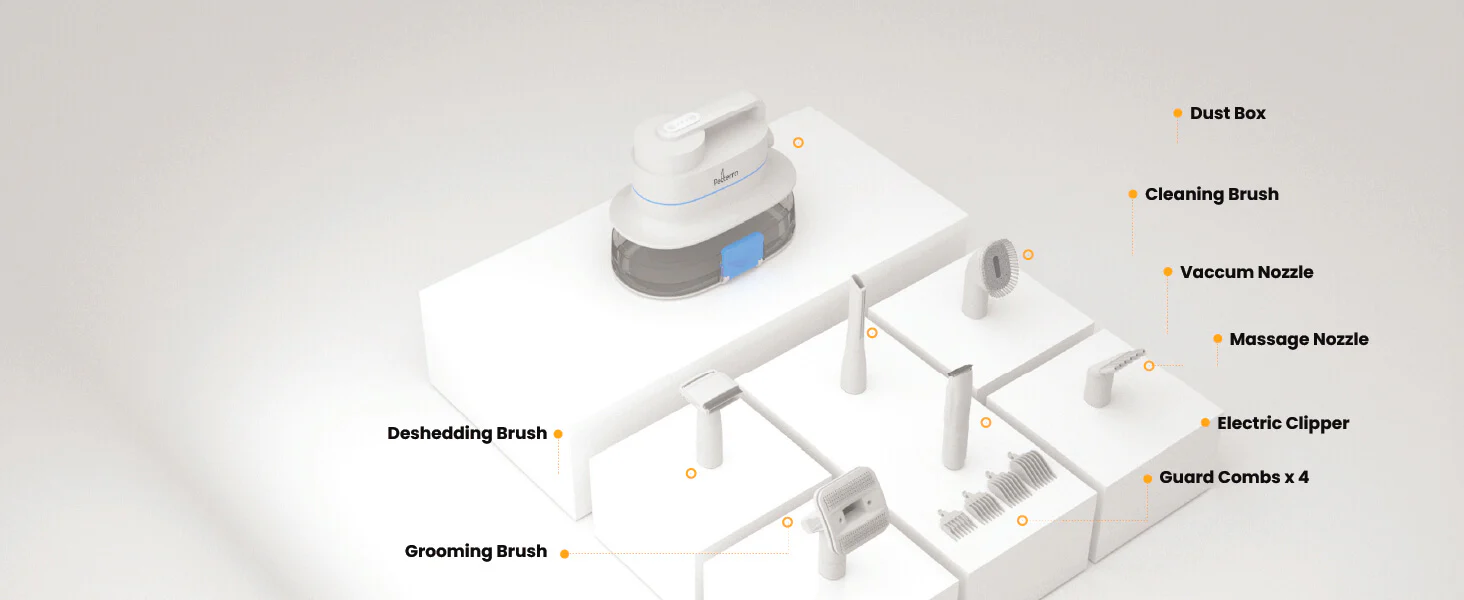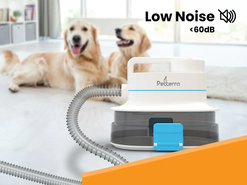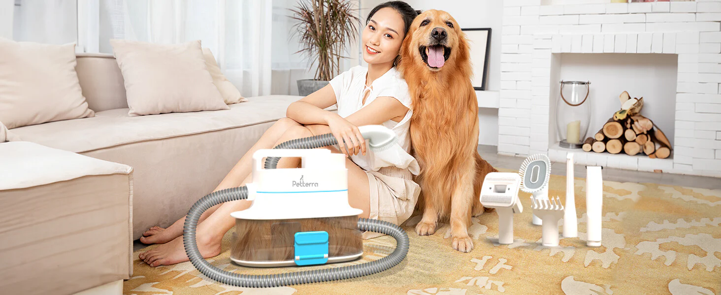 Petterra’s kit combines a pet blower, vacuum cleaner, and trimming tool for effortless grooming