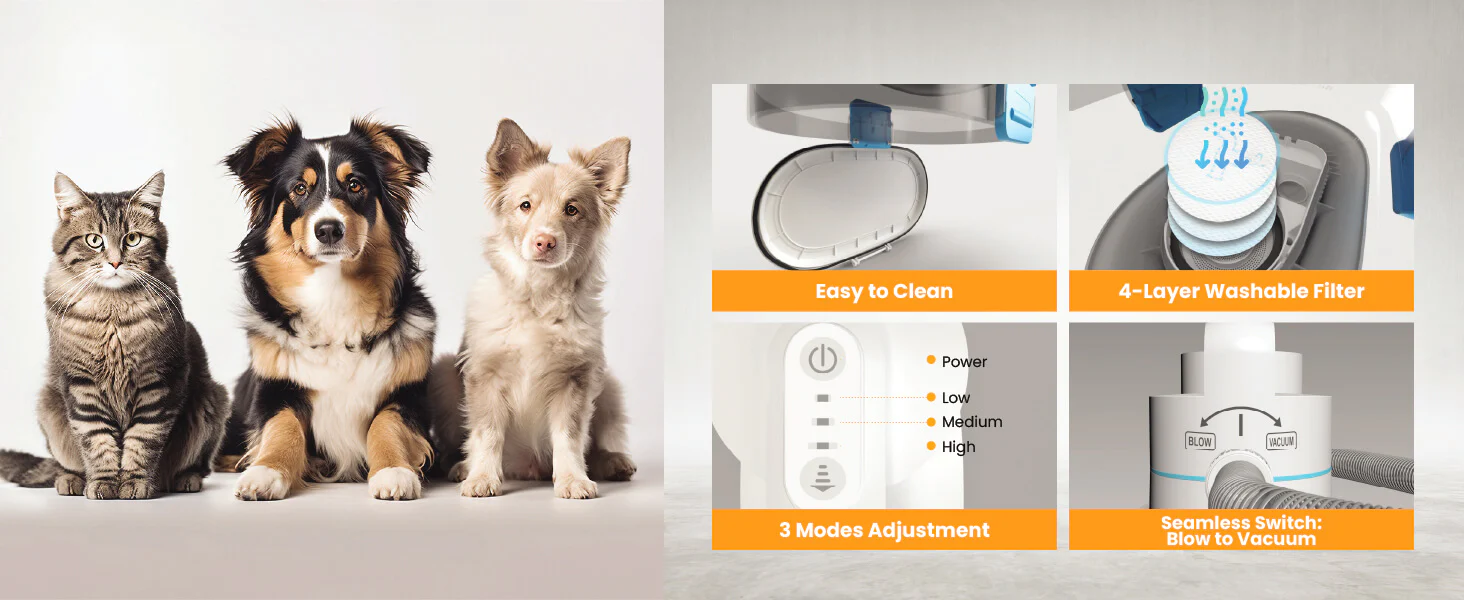 Experience hassle-free drying and grooming with Peterra’s pet dryer function. Our 6-in-1 grooming kit features a built-in blowing feature for gentle and comfortable drying. With a 4L large dust box, easy operation, and quiet operation, enjoy safe and reliable grooming that saves time and money.